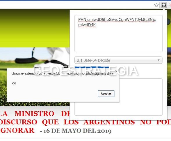 Las vulnerabilidades se manifiestan al ingresarse determinadas porciones de código JavaScript (no probamos con otros lenguajes) en codificación Base64 o en codificación URL en la casilla superior del cuadro de la extensión e intentar decodificar. La imagen que publicamos es suficientemente descriptiva ya que la intención es prevenir, no dar malas ideas. Insistimos en aconsejar tomar los recaudos del caso; felizmente los usuarios de la extensión son relativamente pocos y anónimos. Eso dificulta mucho cualquier aprovechamiento de las vulnerabilidades mencionadas, aunque no lo impide totalmente.